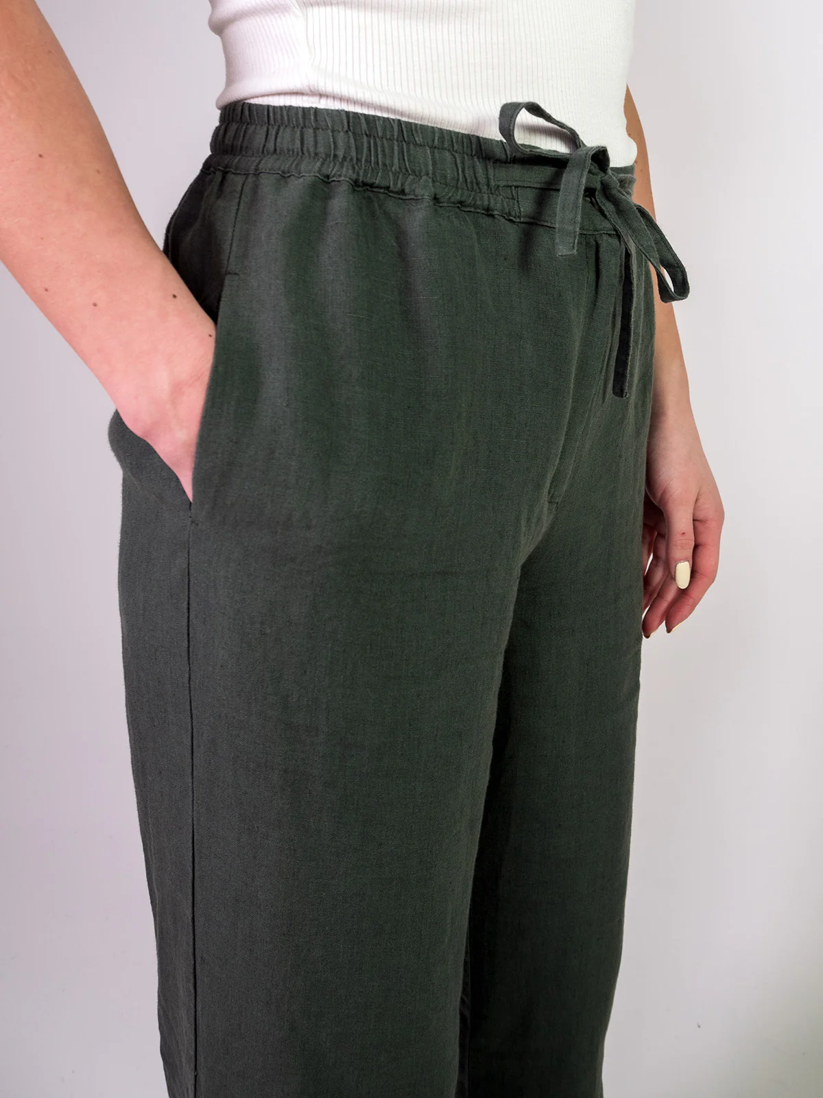 Housut on valmistettu esikutistetusta pellavakankaasta ja lisäksi ne on tuotepesty, joten kotipesussa kutistumaa ei enää tapahdu. CUOSI:n käyttämä pellava on erittäin laadukasta ja miellyttävän tuntuista ihoa vasten.
