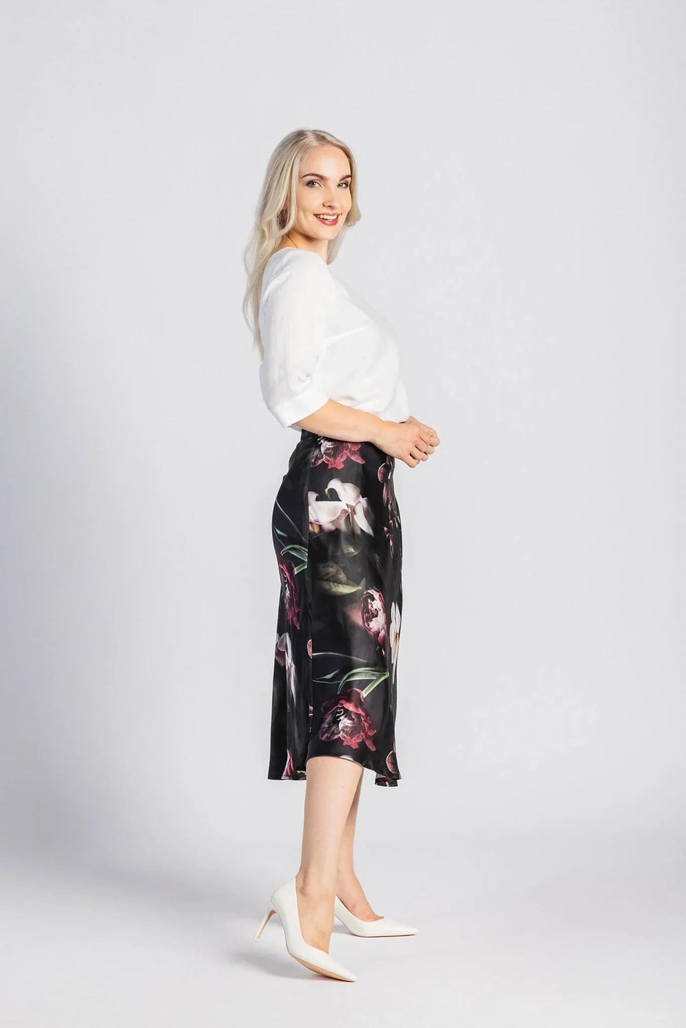 Nakoan tyylikäs Classic Midi Skirt kauniin tummassa Noir-kukkakuosissa!