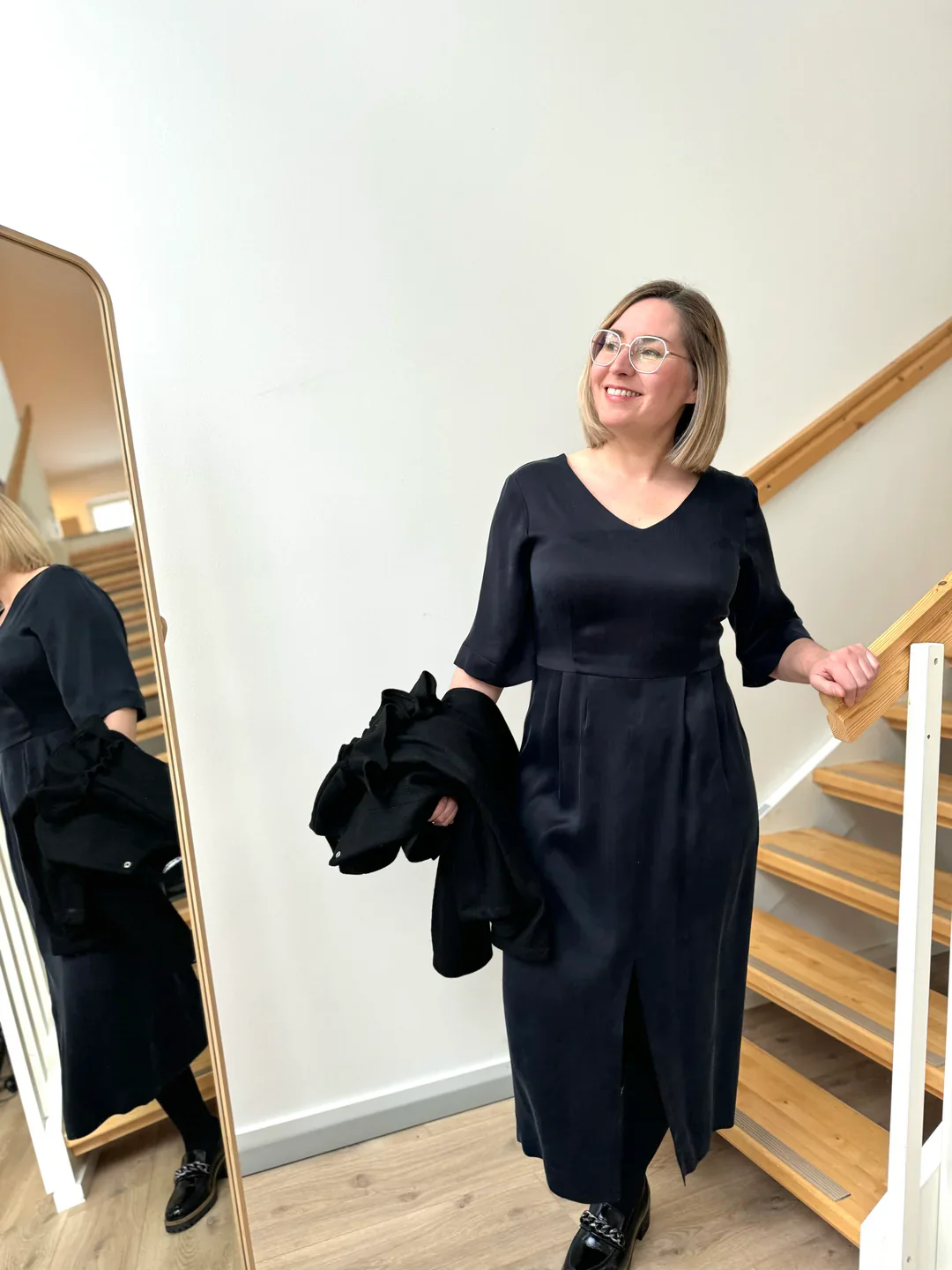 Mekossa on puolipitkät, melko leveät hihat ja v -pääntie niin edessä kuin takana. Takana on myös pitkä vetoketju, joka helpottaa pukeutumista. Mekon helmassa on edessä näyttävä halkio, juuri oikean pituinen. Mekon vyötäröltä löytyy harkitut laskokset, jotka antavat mekolle muotokielen sekä kauniin yksityiskohdan.