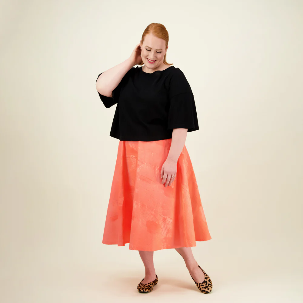 Mieletön neonpinkissä korallisessa sävyssä hehkuva midihame kotimaiselta Metsolalta! Upean mekkomaisen kokonaisuuden saat kun yhdistät samasta kankaasta tehdyn puseron tähän hameeseen.