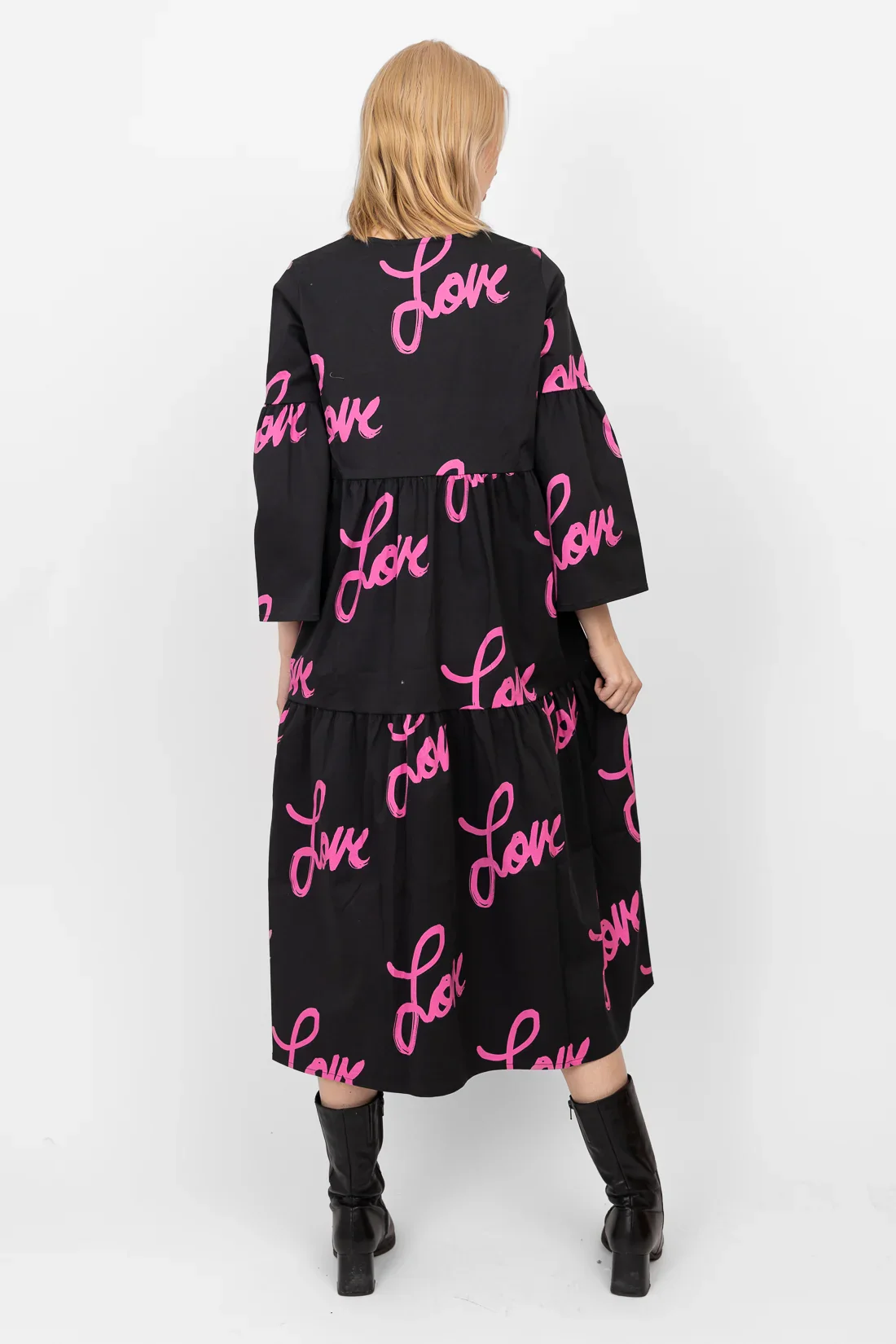 Kotimaisen VIMMAn rakastettu mekkomalli KALLA jo klassikoksi nousseessa musta-pinkissä Love -kuosissa!
