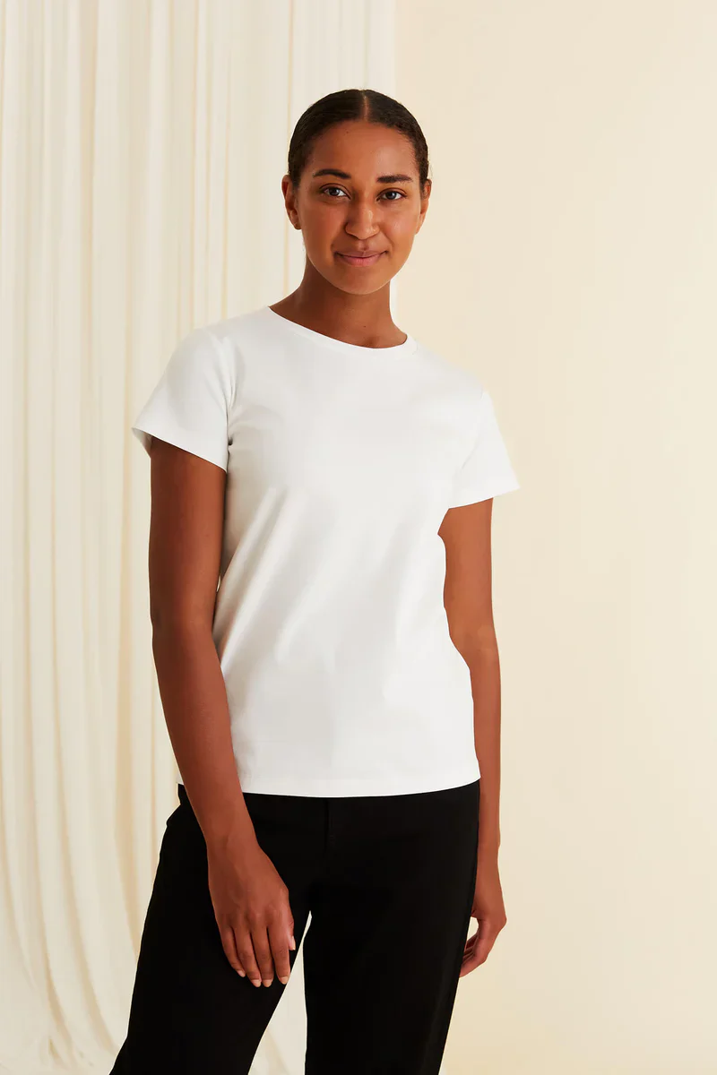 Täydellinen valkoinen t-paita on tässä! Paksua, läpikuultamatonta luomupuuvilla ja tyylikäs ajaton malli.