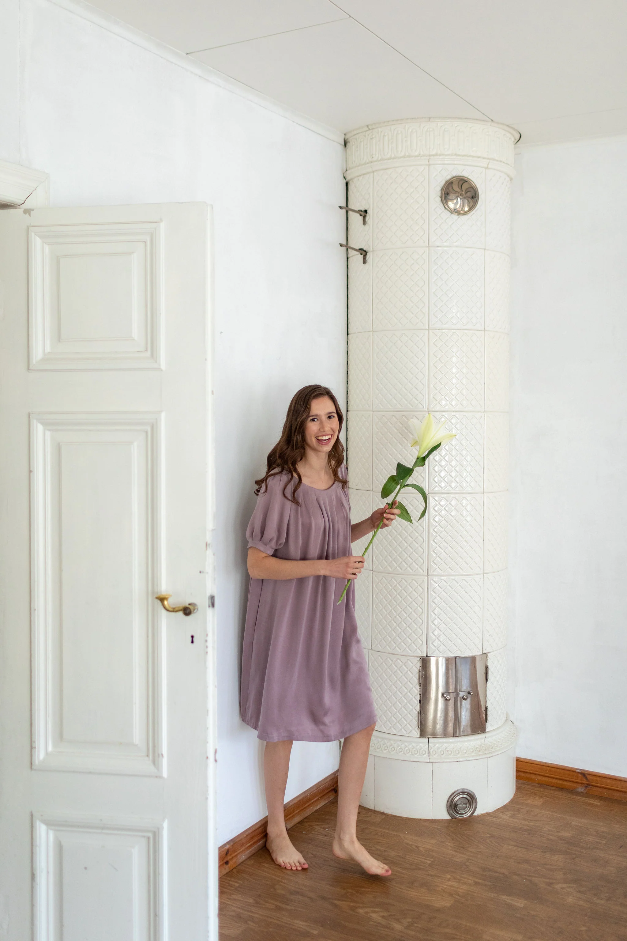Ihana Suomessa suunniteltu ja tehty FeelK Loistan-mekko lyhyellä hihalla. Kaunis herkän roosan väri silkkisen tuntuisessa vegaanisessa kankaassa.